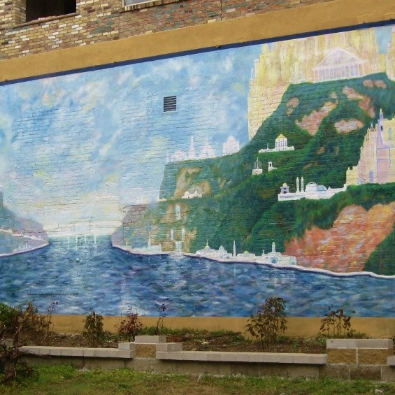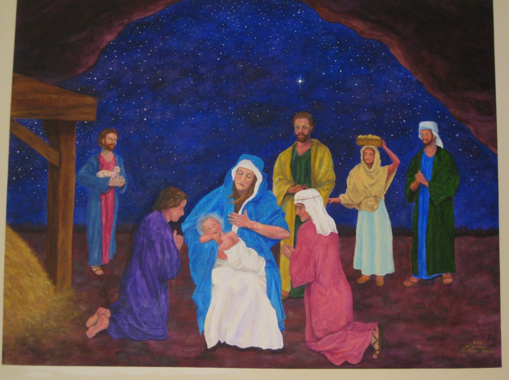 Highland Catholic School Mural, St. Paul, MN, 2007. 5′ x 16′ oil on canvas applied to auditorium/cafeteria wall.