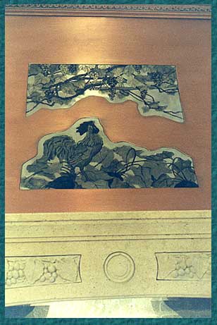 This copper kitchen hood is just one element in a large award winning French provincial kitchen designed by Northstar Services of Minneapolis. The etched pewter design has grapevines and a rooster in a beet field. In 2001, it was featured in Great American Kitchens Vol. II.