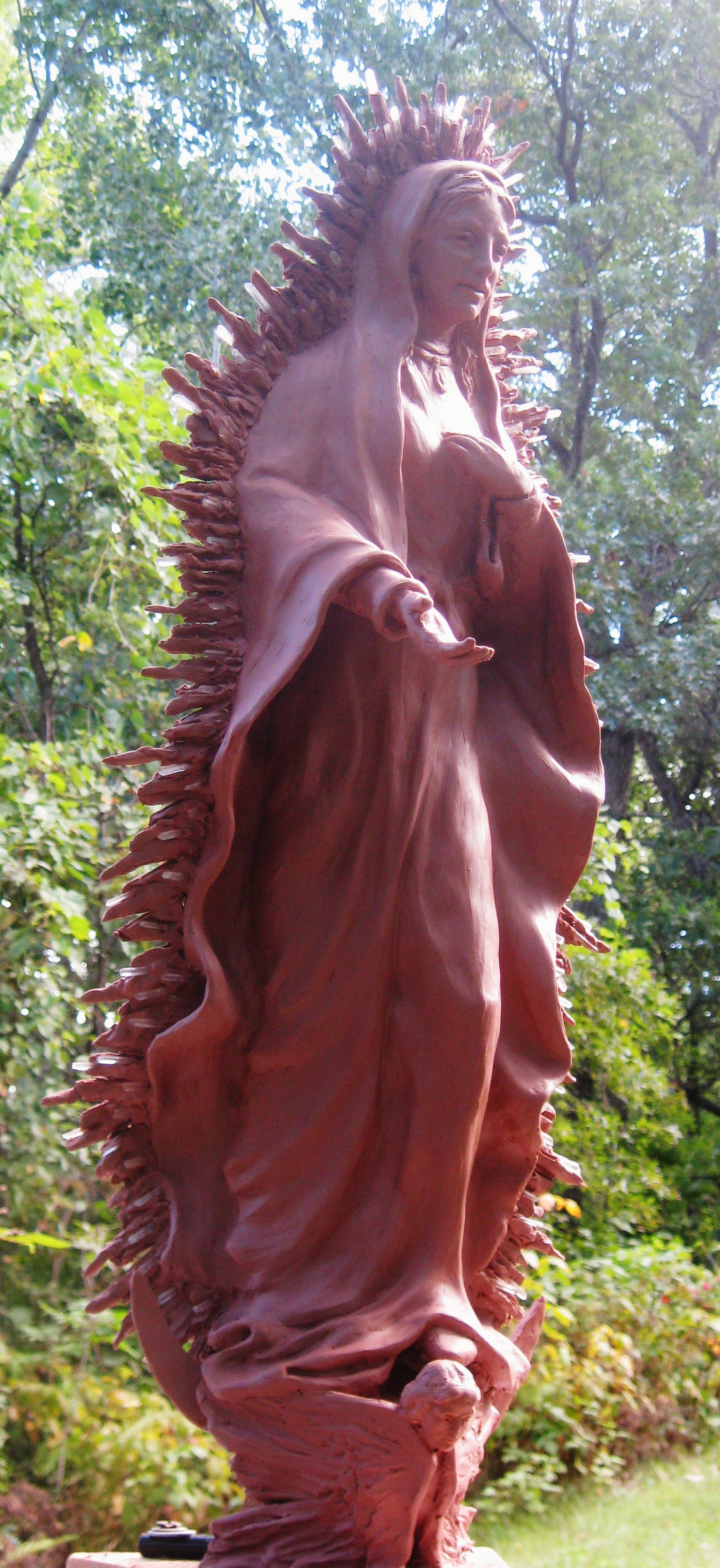 In 2016 I was inspired to create a Virgin of Guadalupe sculpture that would be more compelling and realistic than that produced in the past; a new vision which respects the 1531 AD appearance. God and His emissaries are spirit, forming bodies for our benefit and in ways that can be understood at each epoch of appearance. With that in mind, I took tasteful liberties to bring Mary’s American manifestation to the modern era. The biggest challenge was depicting the rays of light emanating from her. Being literal to the 16th century image has resulted in sculptures showing these either as spikes, or as a solid aura that looks like a shell. Neither is satisfactory. But how to show them as pulsating, living light rays while being true to standards of fine art? My solution was to combine the sculpting of bronze forms of rays in various lengths to imply motion, along with the incorporation of crystals that would capture and reflect sunlight and changing light conditions. As far as I know, this concept is entirely original. My 31″ tall study model in clay and crystal was made in the hope that it will be commissioned as a life-size or other size bronze sculpture to present the vision of the Virgin of Guadalupe as fine art and able to strike a responsive chord in our current era.