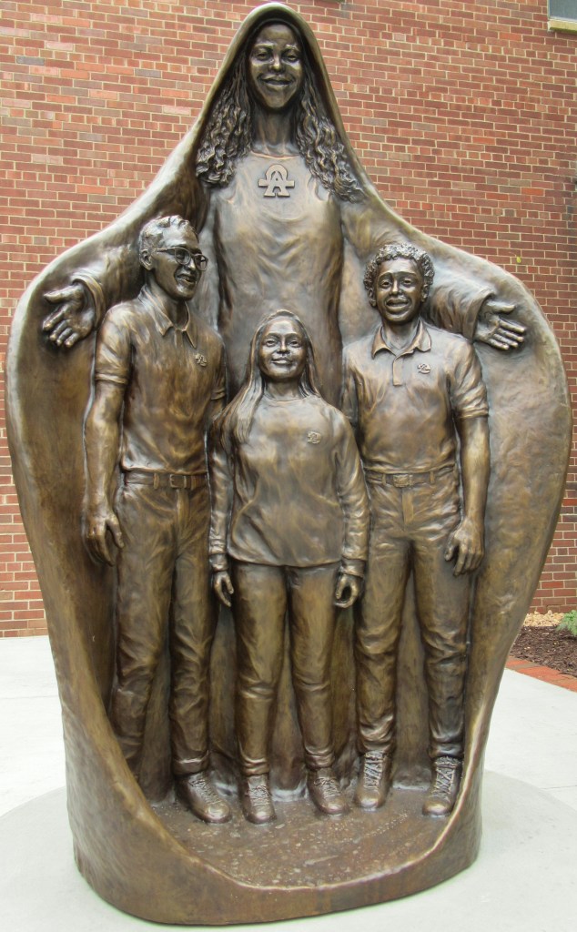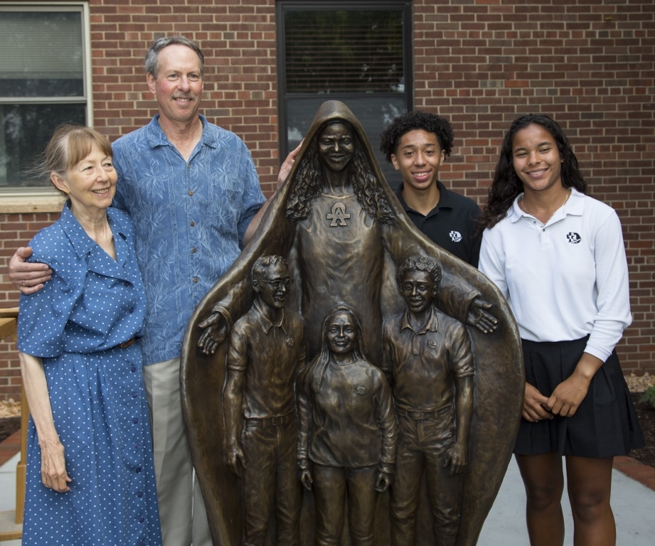 Life-size bronze statue, Hand made 33″ stucco base, 15′ wide triptych with plaster bas-reliefs, bronze roses, stained glass, and painted wood frame.Detail of Mary, Life-size ClaySaint Paul Statue, Bronze, 9 1/2 feet tall atop 6 1/2 foot marble pedestal, Cathedral of St. Paul, MNSaint Paul Statue, Bronze, 4′-10″ tall atop 3′ stone pedestal. Church of St. Paul, Ham Lake, MN. This was cast from the half-size study for the Cathedral of St. Paul sculpture.“The Bountiful Well” Bronze fountain 64″ tall, centerpiece for a wine-tasting room, John Goodman residence, Minnetonka Beach, MNMary Sculpture for Baldwin Prayer Grotto at DeLaSalle High School, Minneapolis, MN, bronze, 5′-6″ tall. A collaboration: Design by Brother Jerome, armature and foundry work by Casting Creations of Howard Lake, DeLaSalle students posed for all four figures and applied clay to abstract shapes, figures sculpted by Glenn TerryDedication of the Mary Sculpture and Baldwin Family Prayer Grotto at DeLaSalle High School, Minneapolis, MN on August 28, 2020. The sculptor and his wife to the left, two of the four students who posed for the sculpture to the right. Photo by King Studios of Minneapolis.